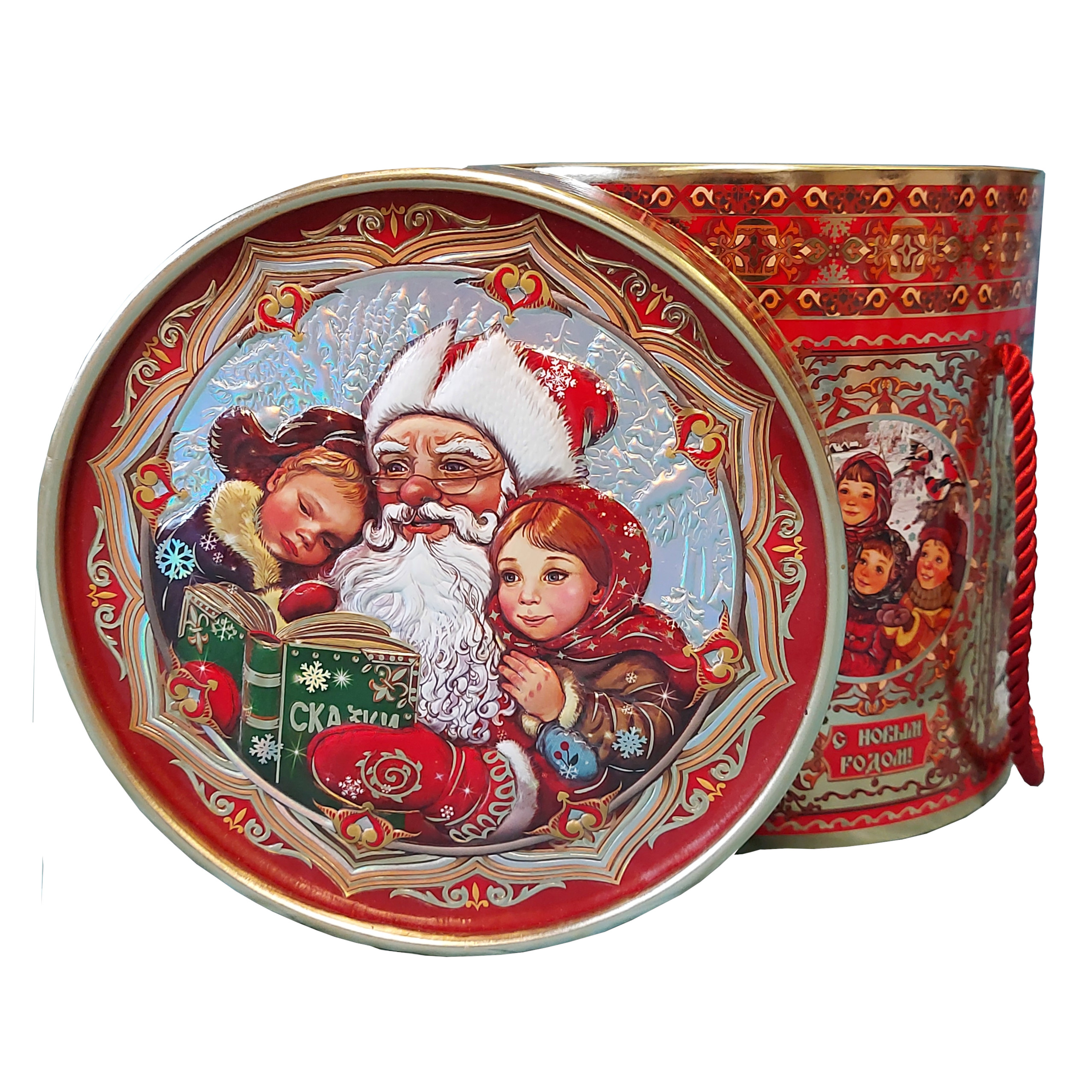 Роскошная туба с ретро-миниатюрами с круговым тиснением. На крышке изображен Дедушка Мороз в окружении детей. Тиснение на крышке золотом и радужным серебром и, как всегда, объёмный 3Д конгрев! Крышку тубы можно использовать в качестве настенной картины. Сюрприз внутри каждого подарка - игрушка тянучка гусь антистресс - компактная, приятная и гладкая на ощупь, до 9 см в длину, выполнена из технологичного и безопасного материала.